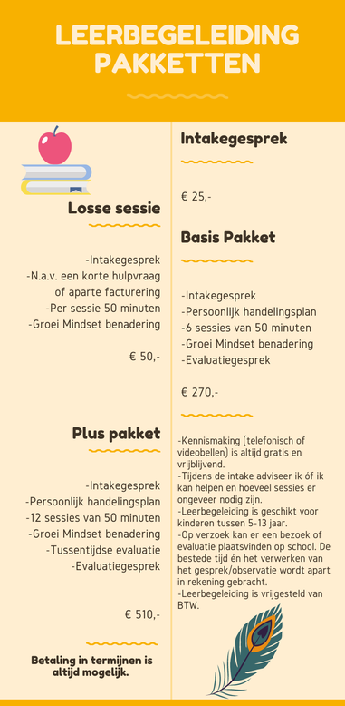 Tijdens het gratis intakegesprek, is het voor mij belangrijk om te weten te komen wat de vraag van jou én je kind is én hoe hij/zij het fijnst leert. Tijdens mijn begeleidingsmomenten kies is dan de aanpak die het best bij jouw kind past. Tijdens de begeleiding ben ik hiernaast altijd bezig met mindset coaching. Want een goede mindset heeft natuurlijk ook effect op het leren. Denkt jouw kind steeds 'ik kan het toch niet' in plaats van 'ik kan het nog niet'? Dan is de groei mindset benadering ook voor jouw kind helpend.