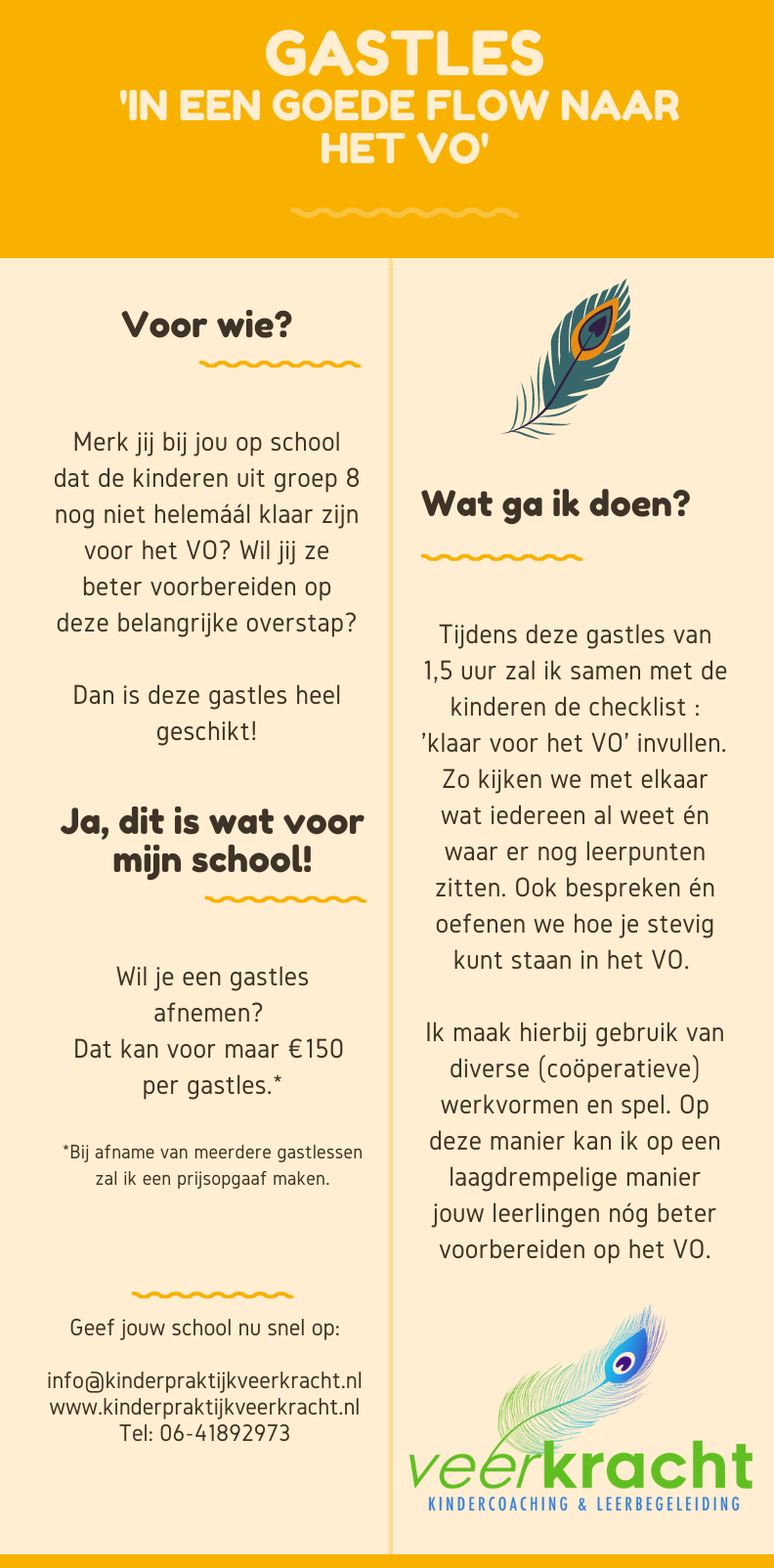 Ook bereid ik kinderen voor op het VO middels de groepstraining: ‘Met een goede Flow naar het VO.’ Meer informatie hierover vind je bij (groeps)trainingen.